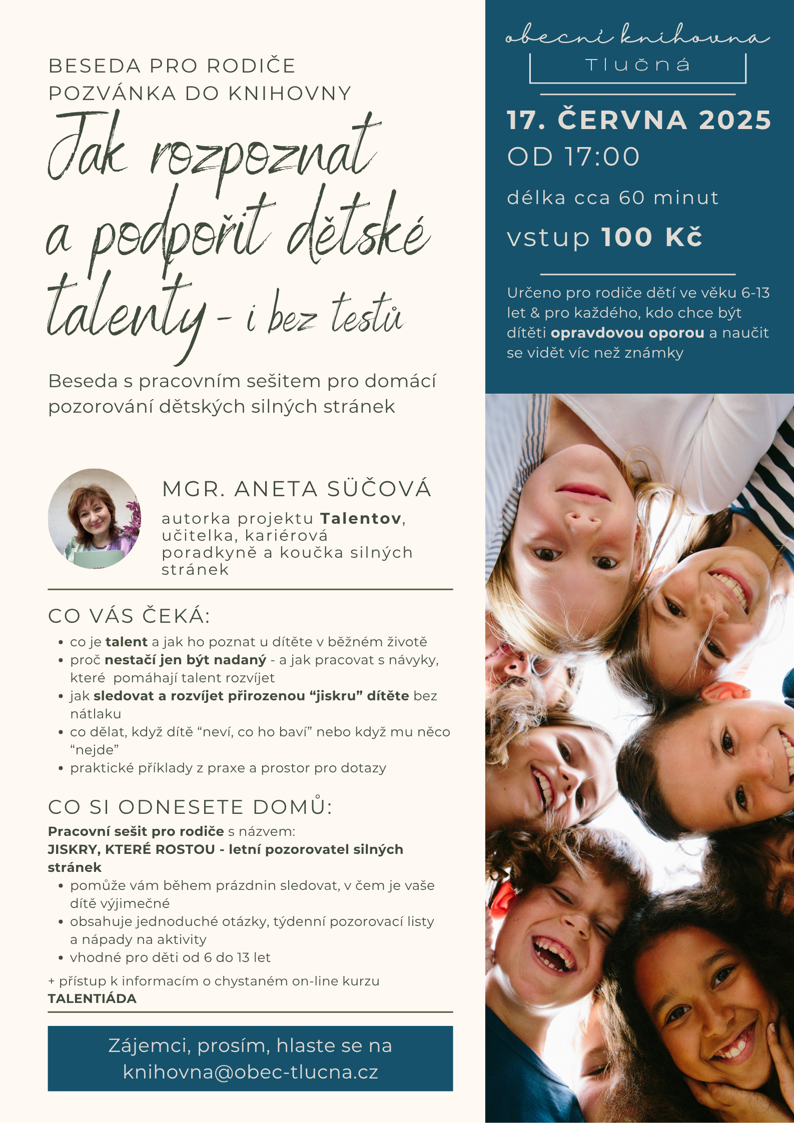 17. června jsme se v pozdních odpoledních hodinách sešly (ano, byl to takový dámský klub) nad velmi obohacujícím tématem dětských talentů. Průvodcem nám byla Mgr. Aneta Süčová, autorka projektu Talentov, učitelka, kariérová poradkyně a koučka silných stránek.
