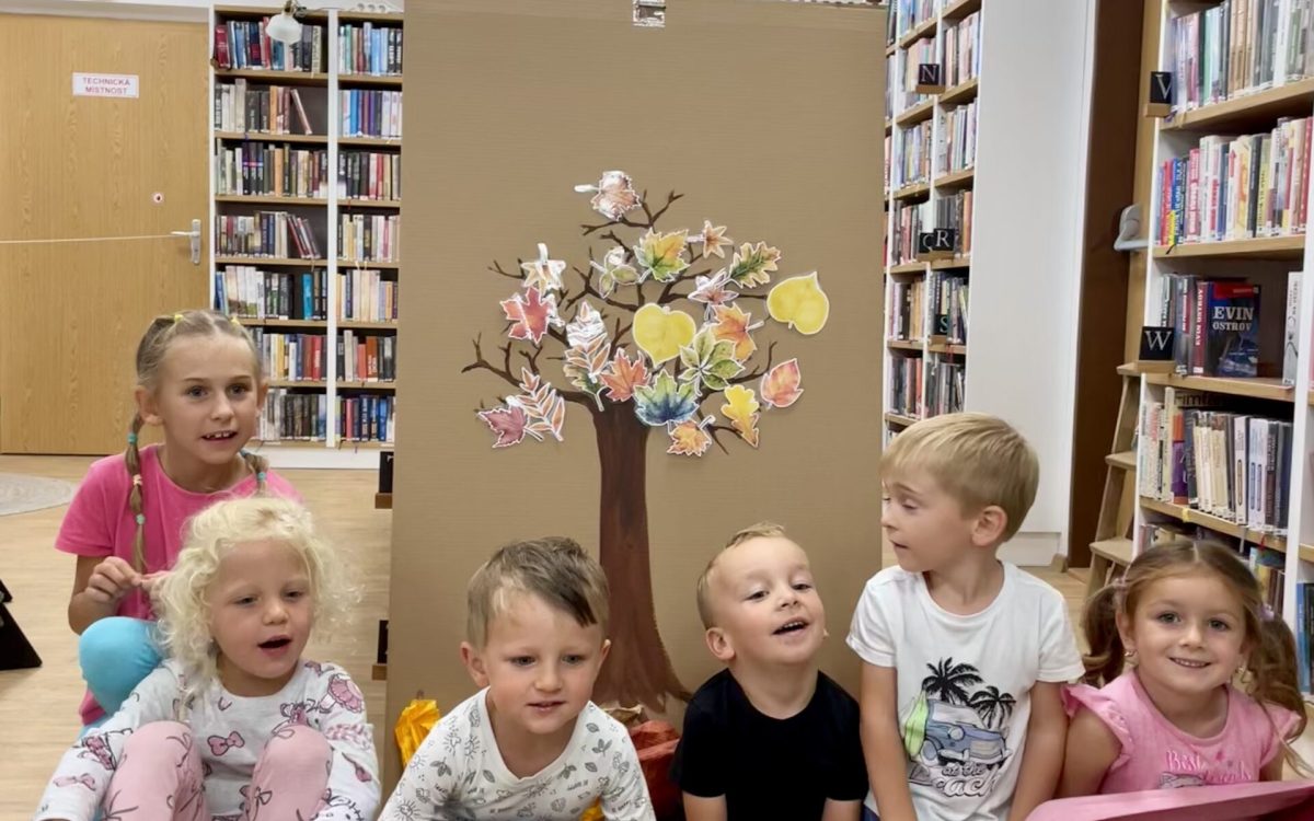 Knihovna se obarvila odstíny podzimního listí. Přečetli jsme si starý příběh o pomoci a o tom, proč některé stromy neopadávají. Děti společnými silami vrátily zpět hromady popadaného listí na úplně holý strom. Ukázaly, že už velmi dobře vědí, co si v tomto nevyzpytatelném počasí obléct na procházku ven, odhalily všechny podzimní stíny a nakonec si vyrobily pestrobarevné deštníky do upršeného dne.