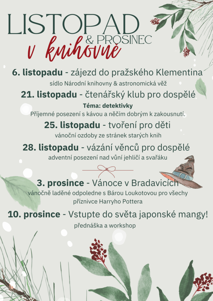 Milí čtenáři, přeji příjemné pondělí (alespoň tak moc, jak jen dokáže pondělí příjemné být 🍀). Koncem minulého týdne jsem slibovala soupis listopadových (a kousek prosincových) akcí a aktivit v knihovně. No a protože sliby se plnit mají, můžete se už nyní ponořit do toho, co nás v následujících týdnech čeká. Hned na začátku mohu naznačit, že mezi akcemi najdete skutečné perly.