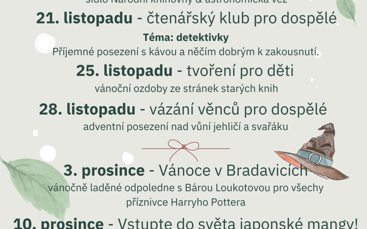 Milí čtenáři, přeji příjemné pondělí (alespoň tak moc, jak jen dokáže pondělí příjemné být 🍀). Koncem minulého týdne jsem slibovala soupis listopadových (a kousek prosincových) akcí a aktivit v knihovně. No a protože sliby se plnit mají, můžete se už nyní ponořit do toho, co nás v následujících týdnech čeká. Hned na začátku mohu naznačit, že mezi akcemi najdete skutečné perly.
