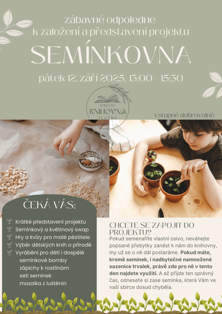 Přinášíme Vám pozvánku ze série „Knihovna se snaží zahltit čtenáře“. Tentokrát bychom Vás rádi pozvali na zábavné odpoledne k příležitosti zakládání obecní Semínkovny.