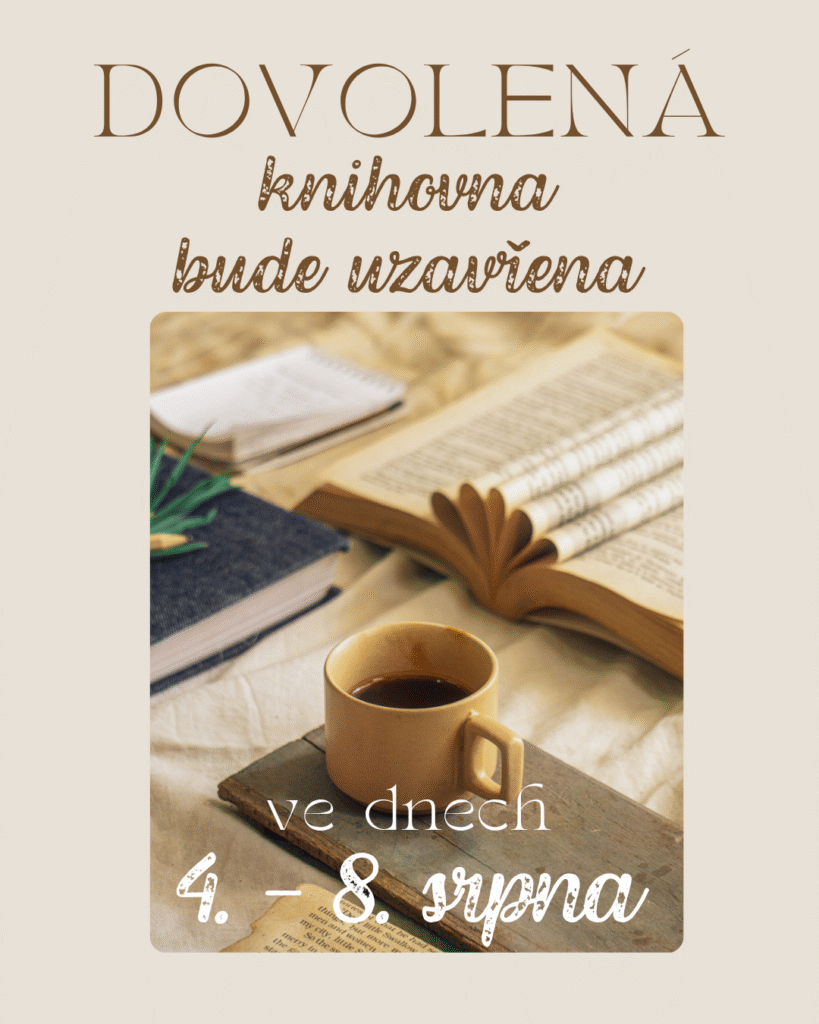 Vážení čtenáři, ve dnech 4. – 8. srpna bude knihovna z důvodu dovolené uzavřena.