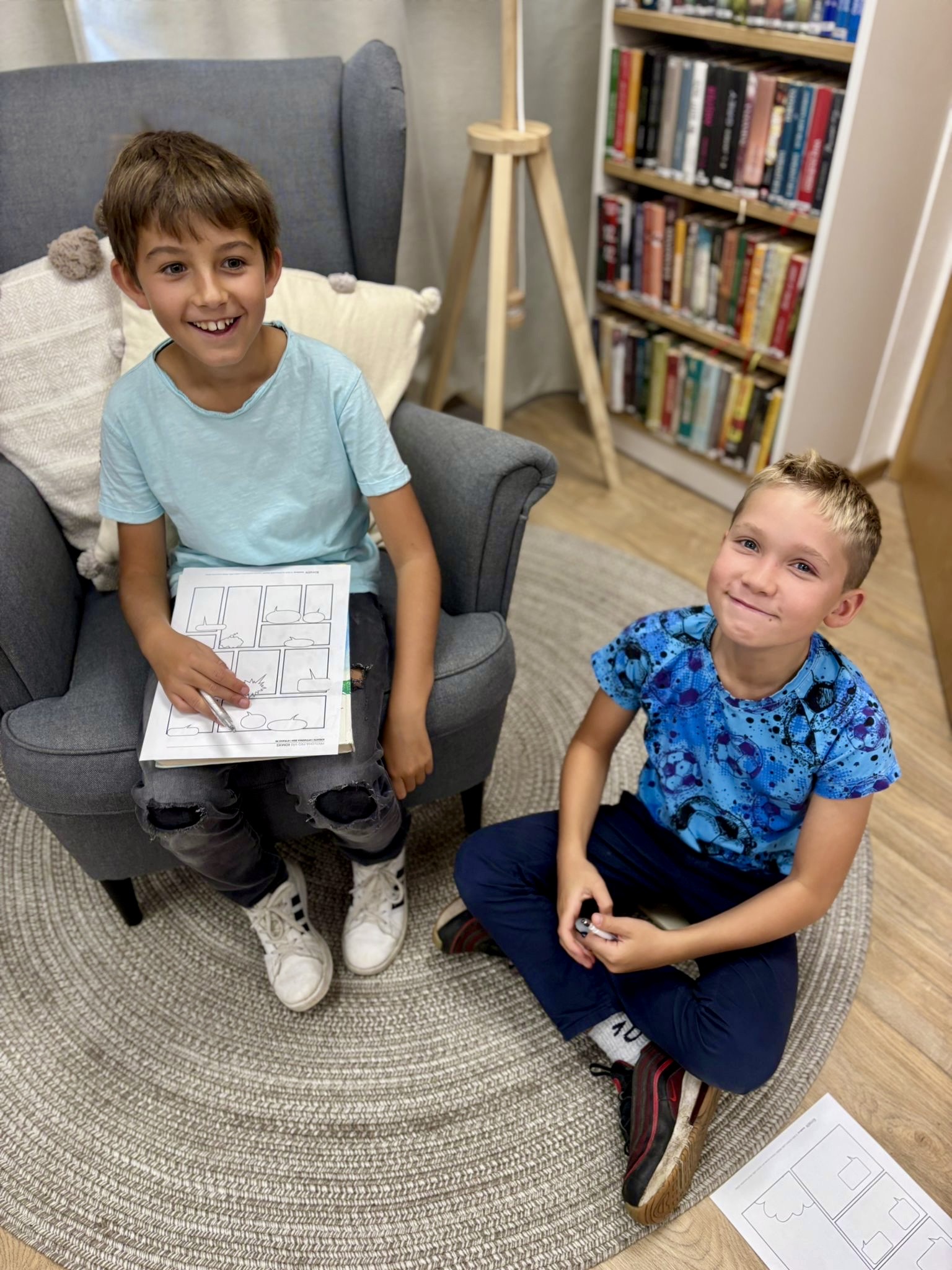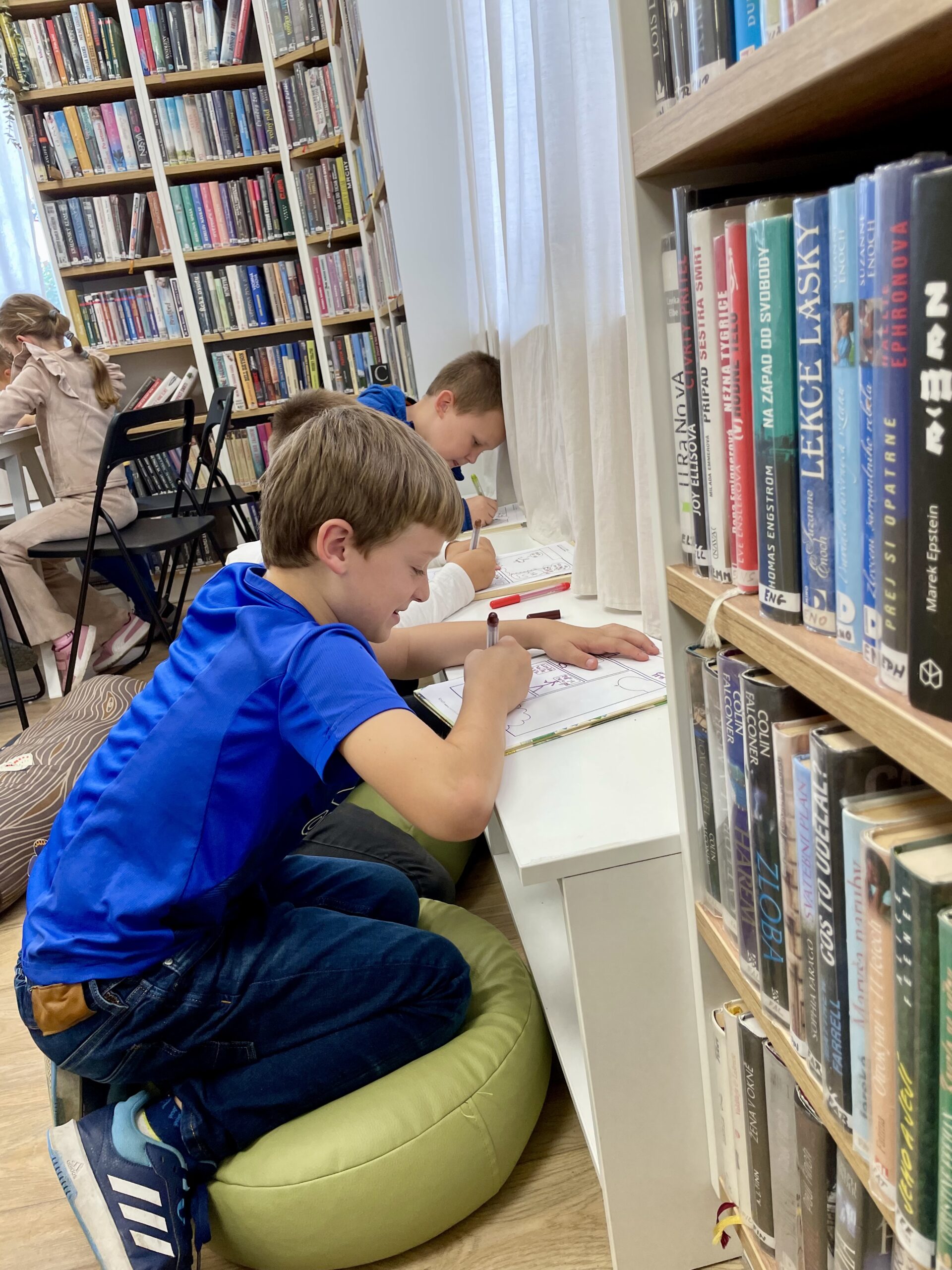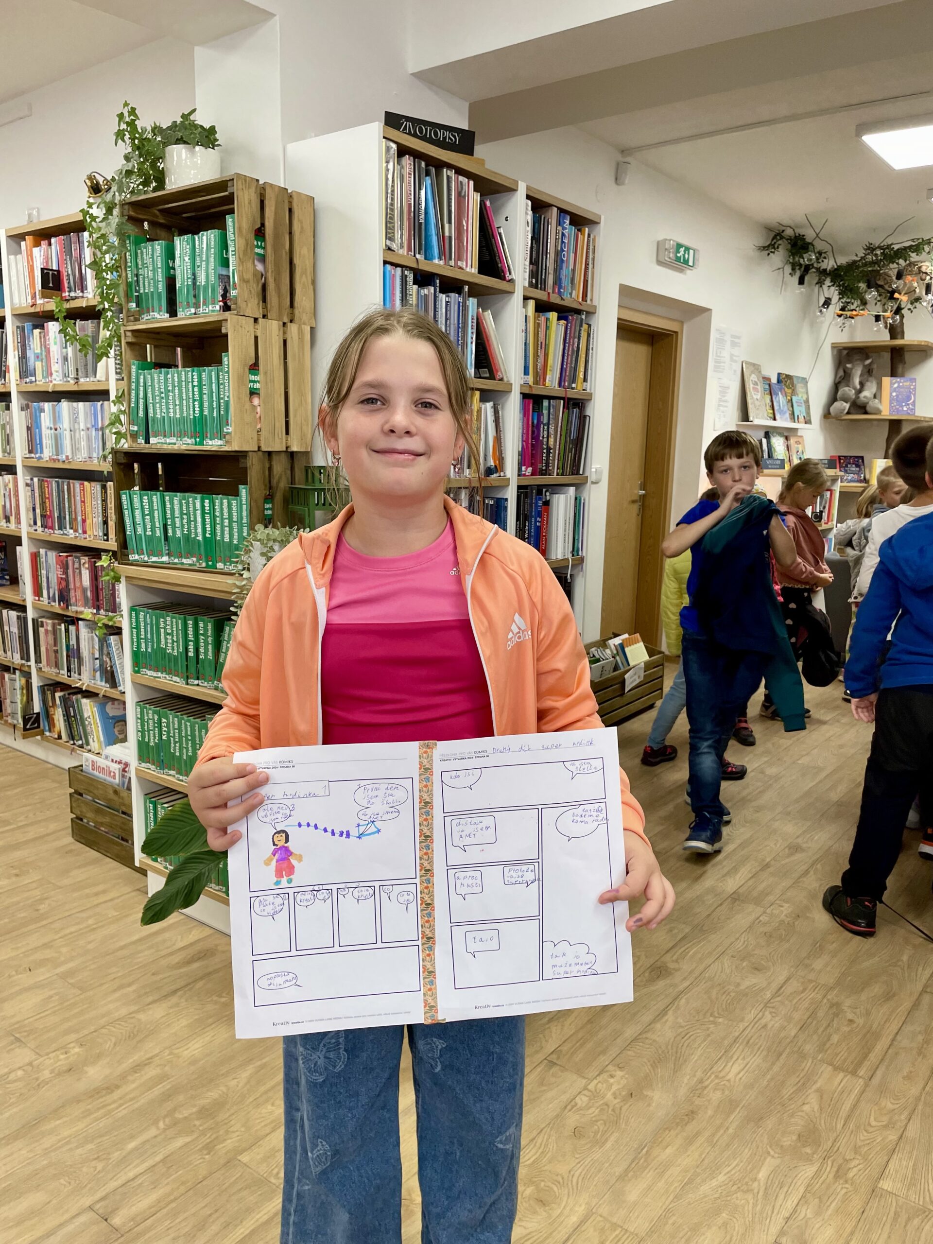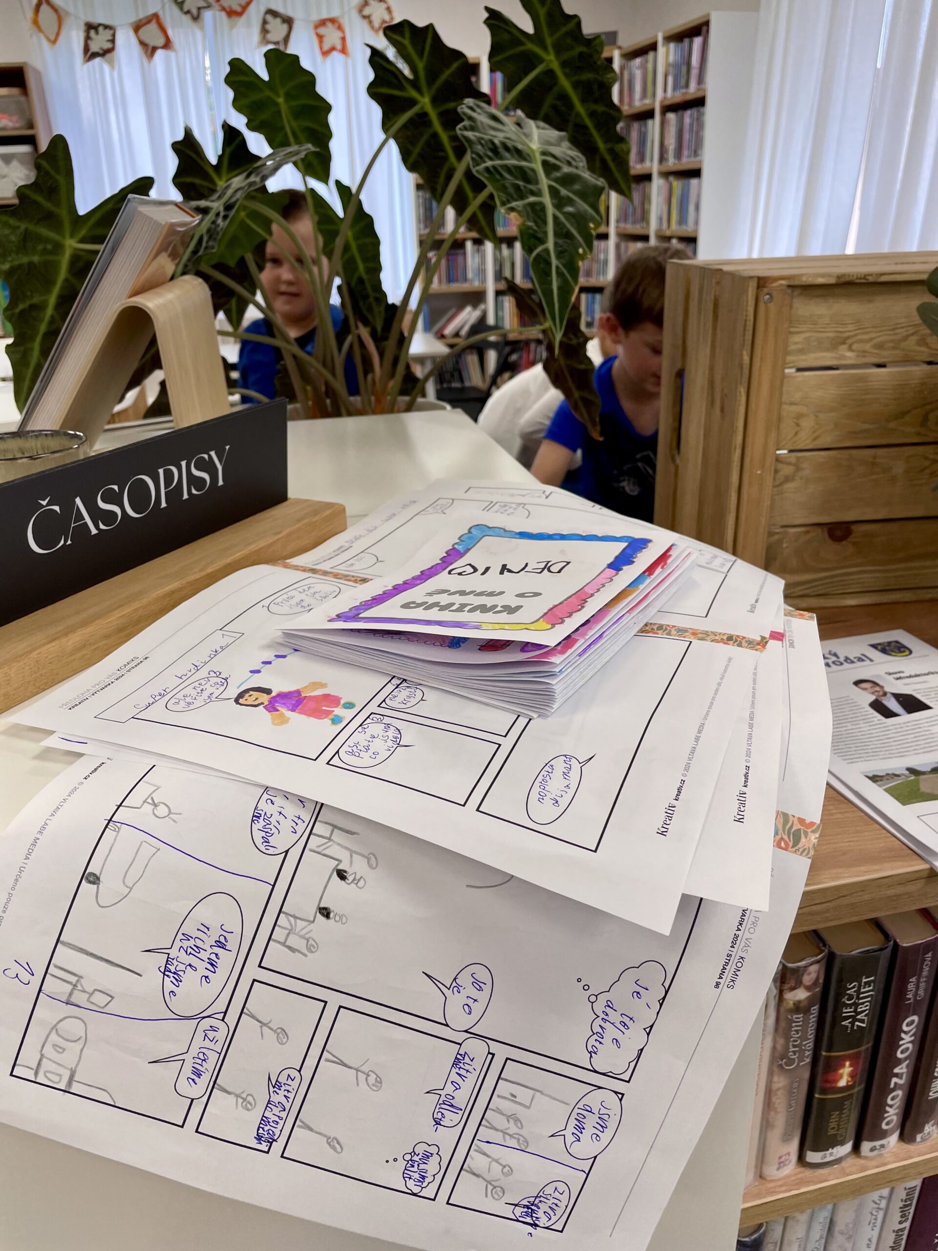 Oproti tomu čtvrťáci, kteří už knihovní pravidla znají jako své boty (viďte?), věděli kudy kam, a tak se na zajímavé knihy chtěli vrhat rovnou. Přísná knihovnice si však i pro ně připravila mučicí aktivitu v podobě tvorby vlastního komiksu, do které se nakonec zabrali natolik, že na ty žádané knihy tolik času nezbylo. Na optimističtějších literárních tématech zapracujeme příště.